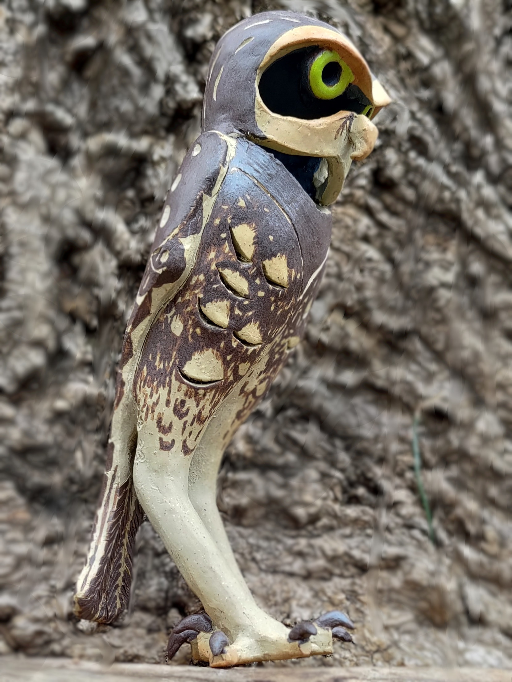 This piece was created during my tenure at the Helen Dewitt-Jones Center for the Arts Clay Studio in Lubbock, Texas. I loved watching the burrowing owls which inhabited old prairie dog burrows on the high plains. Their behavior is significantly different than that of other owls. These little guys spend more time running that flying, thus the long legs, and have some of the most diverse “expressions” seen in owls.