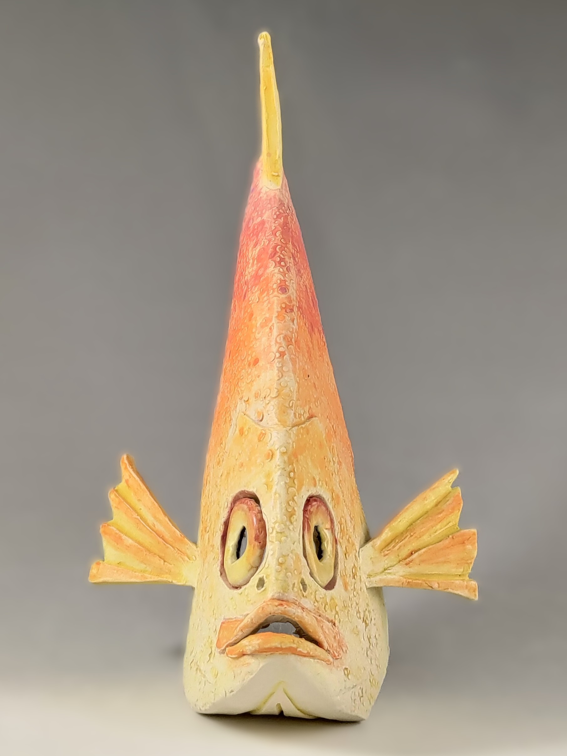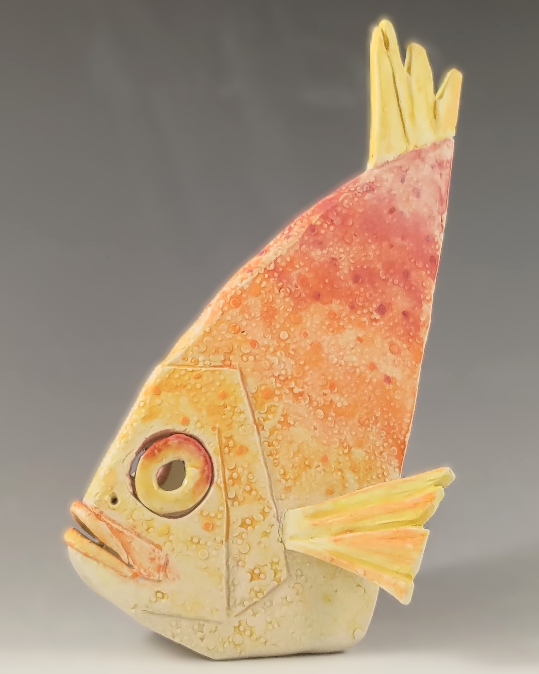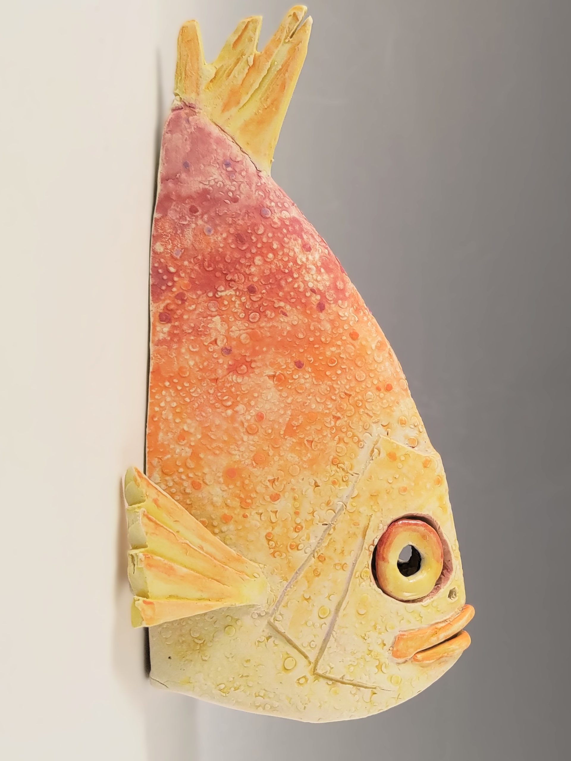 This bright girl is outside my usual palette but I do love the diversity of colors and facial expressions in coral reef fish. The hues seem to add to their personalities. This was the first piece I made when I returned to my current studio in Alexandria Virginia and I was glad to be back!