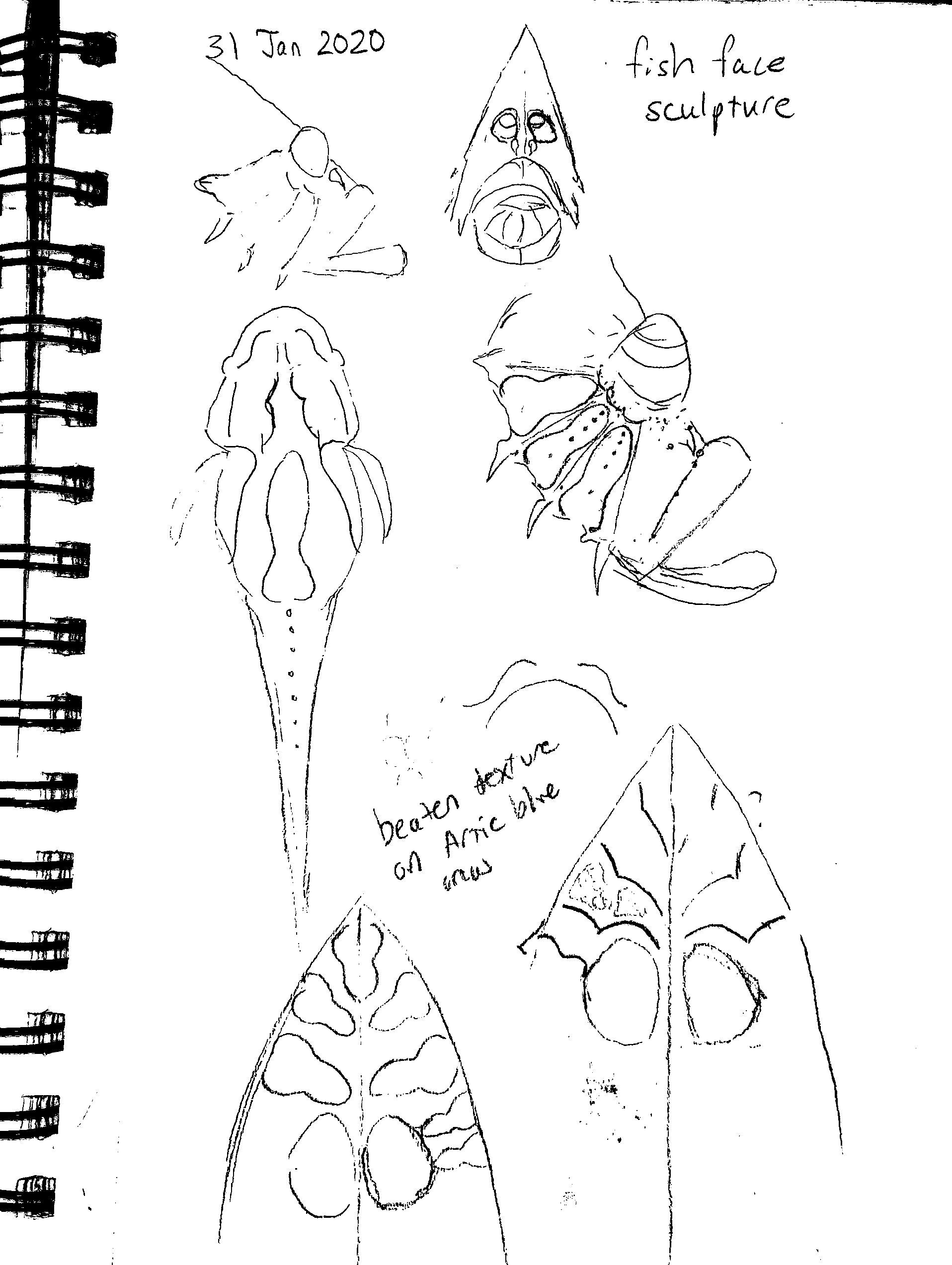 This sad looking fellow was inspired by some sculptures I saw in Philadelphia and a deep sea fish called a hatchet fish with the most morose and pained expressions. I had intended to do a series of these to capture the diversity of those expressions and as I write this I am considering adding them to the cue. The semi-fluorescent dots represent the bioluminescent spots often seen on deep see creatures. The bottom 4 drawings are where I worked out where the lines of spots will go. The lines on the face and body are those rows.