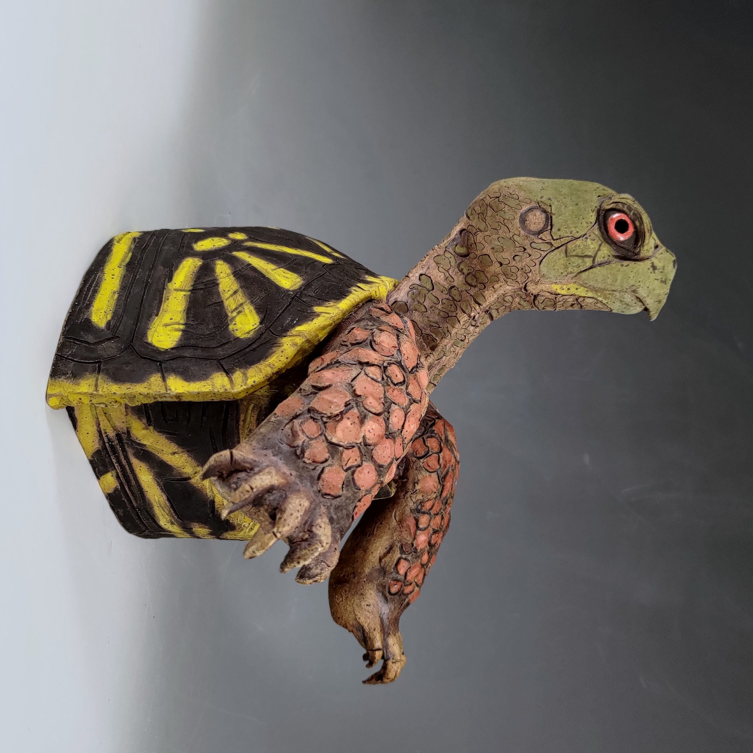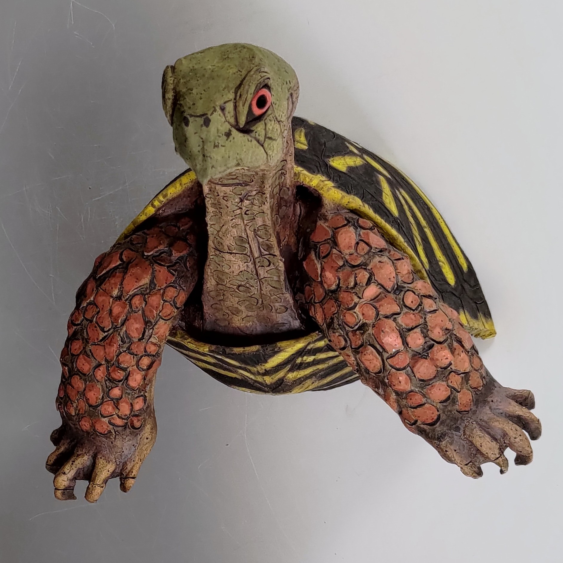 This Ornate Box Turtle has the coloring of those I used to see in West Texas. The males have green heads, striking red eyes, a brightly colored scales on their front legs. The hues are likely a way to attract females. It is more detailed than most of my pieces I think because I wanted to capture the beauty of the place I lived for so long.