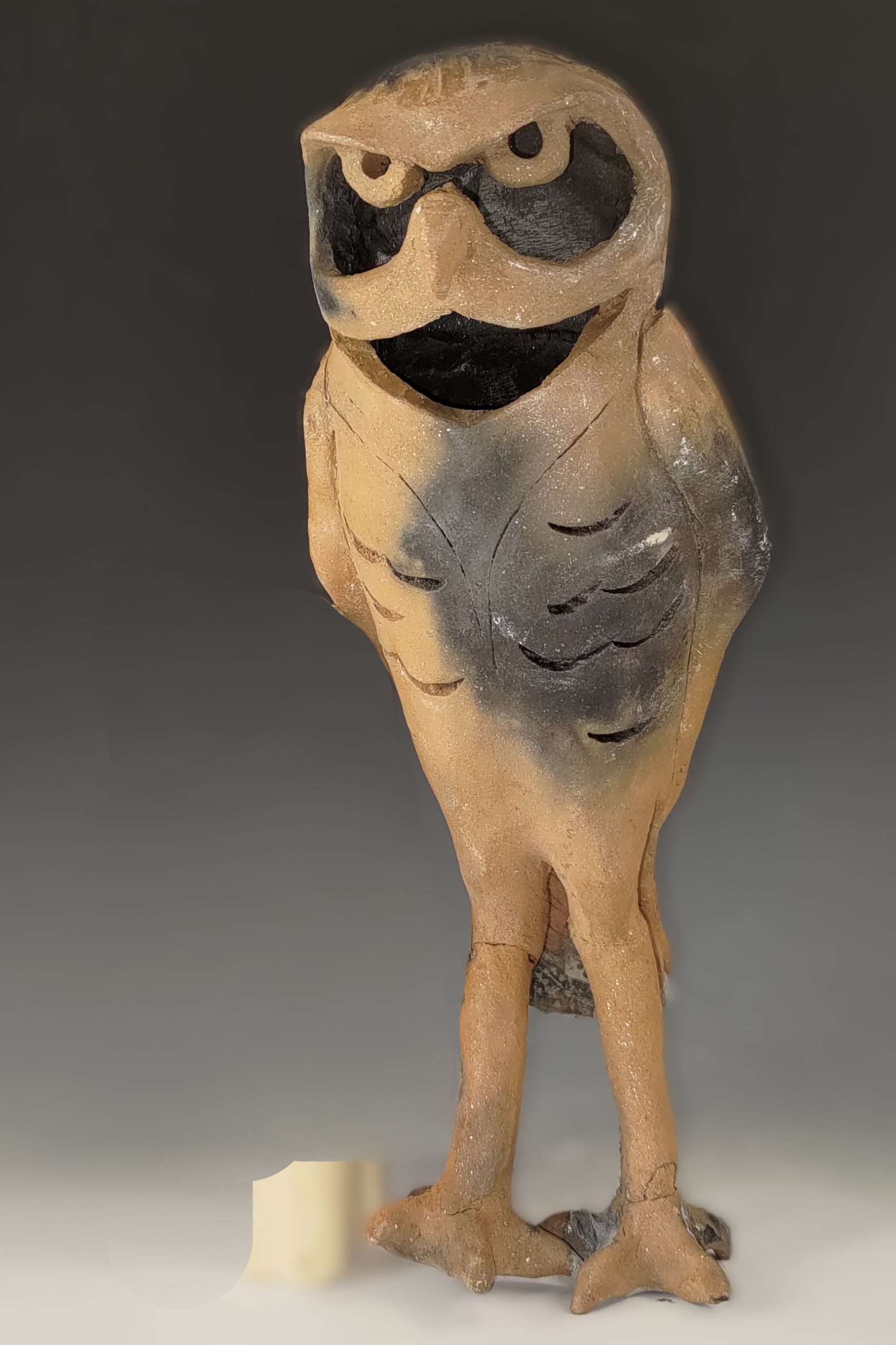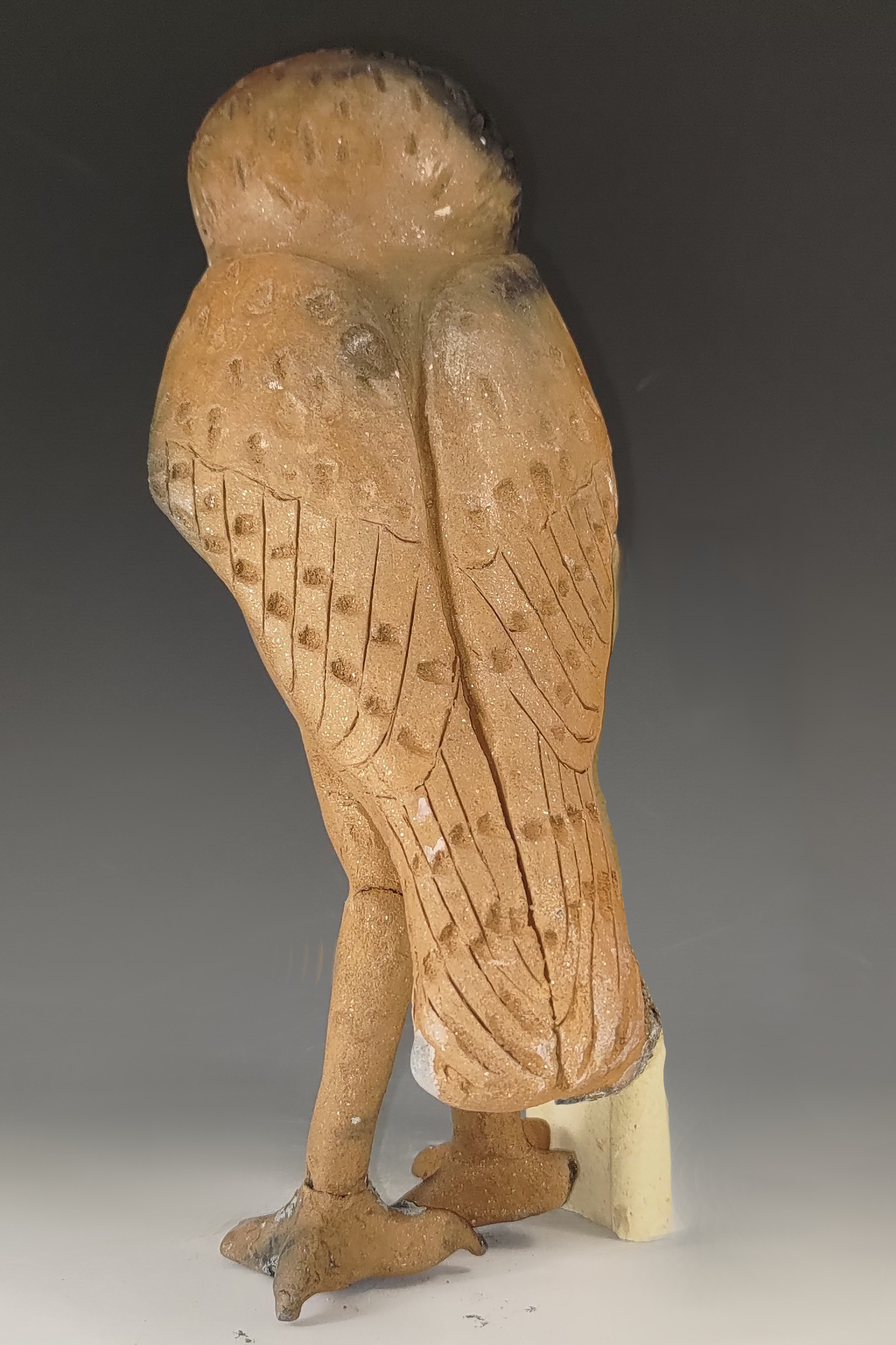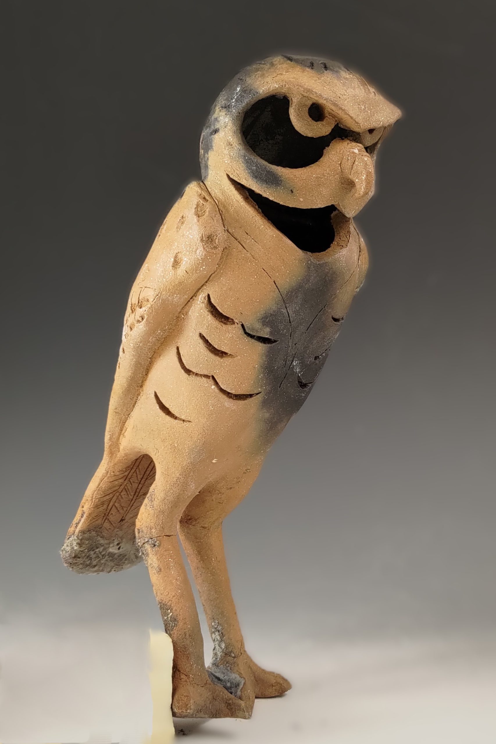 The fierce stare of this owl has a subtle sparkle because it was made out of micaceous wild clay and pit fired. The clay was collected locally in Virginia and the piece created in 2019. As you can see from the missing toes and mended breaks it is a very fragile piece. Unfortunately it ended up with carbon coring which occurs when there is not enough oxygen in the fire to burn off the carbon particles frequently found in wild clay. It creates a black core in a broken cross section of the ceramic and quite a brittle piece. It is one of my earliest sculptures which I did before I started to work with commercial clay.