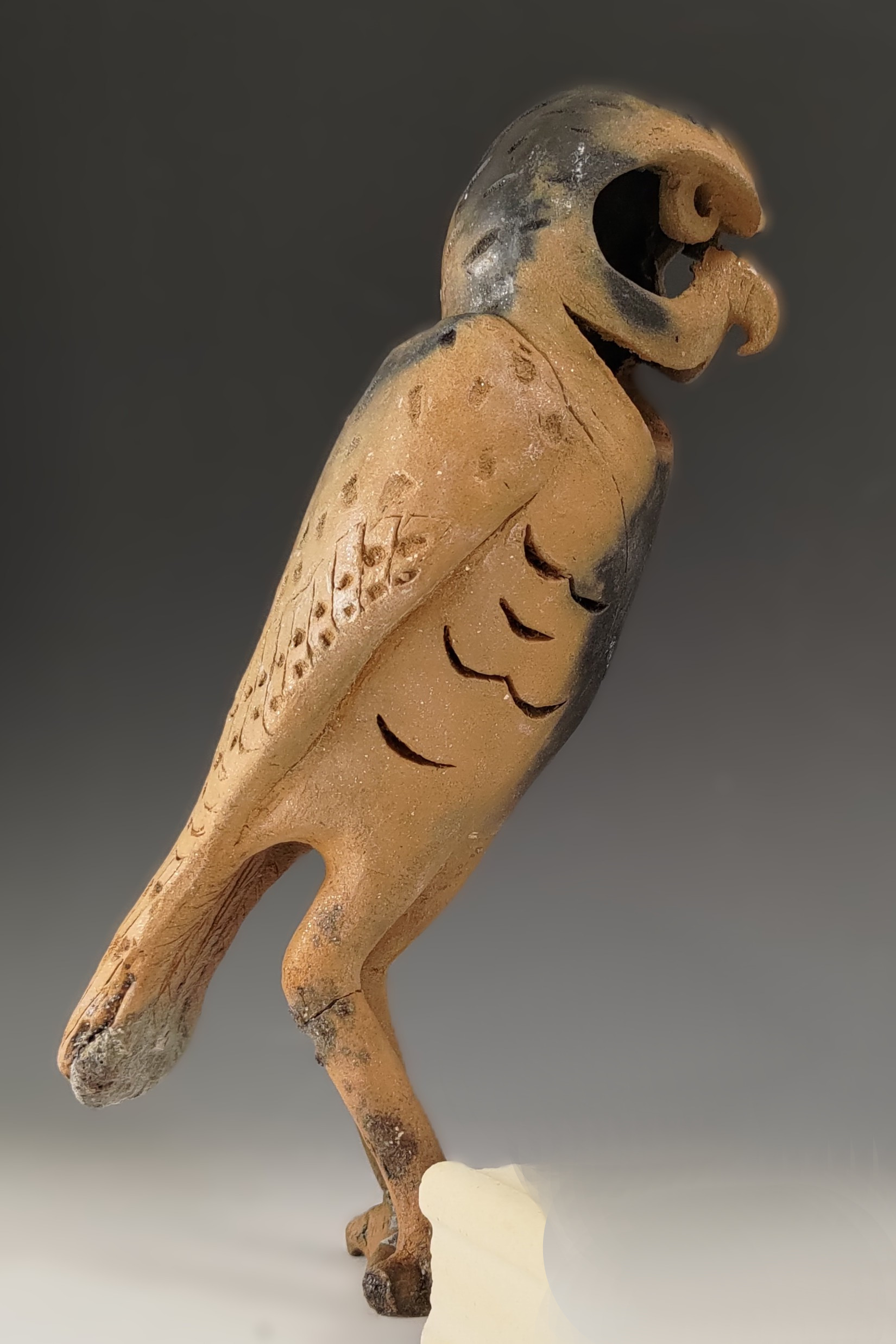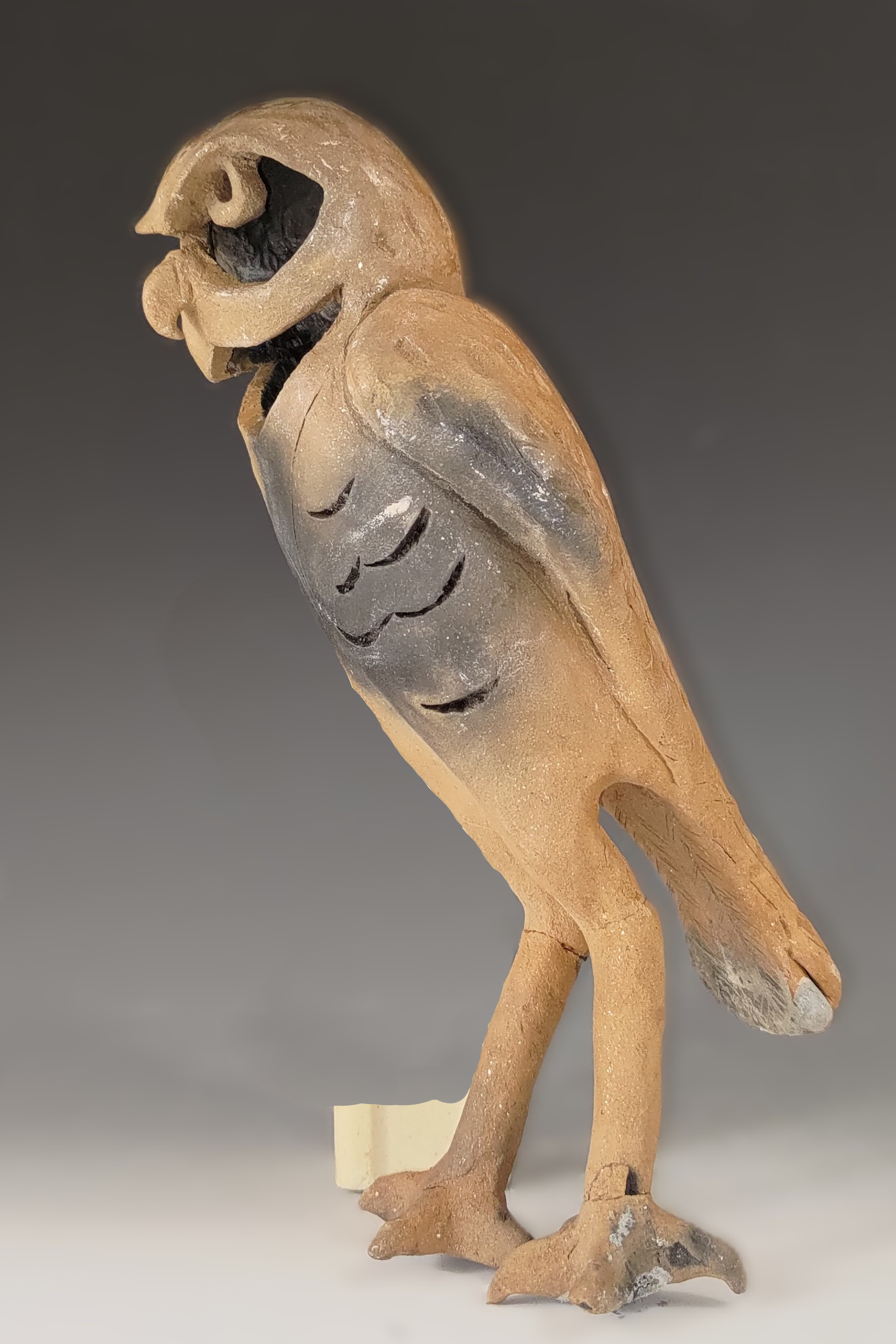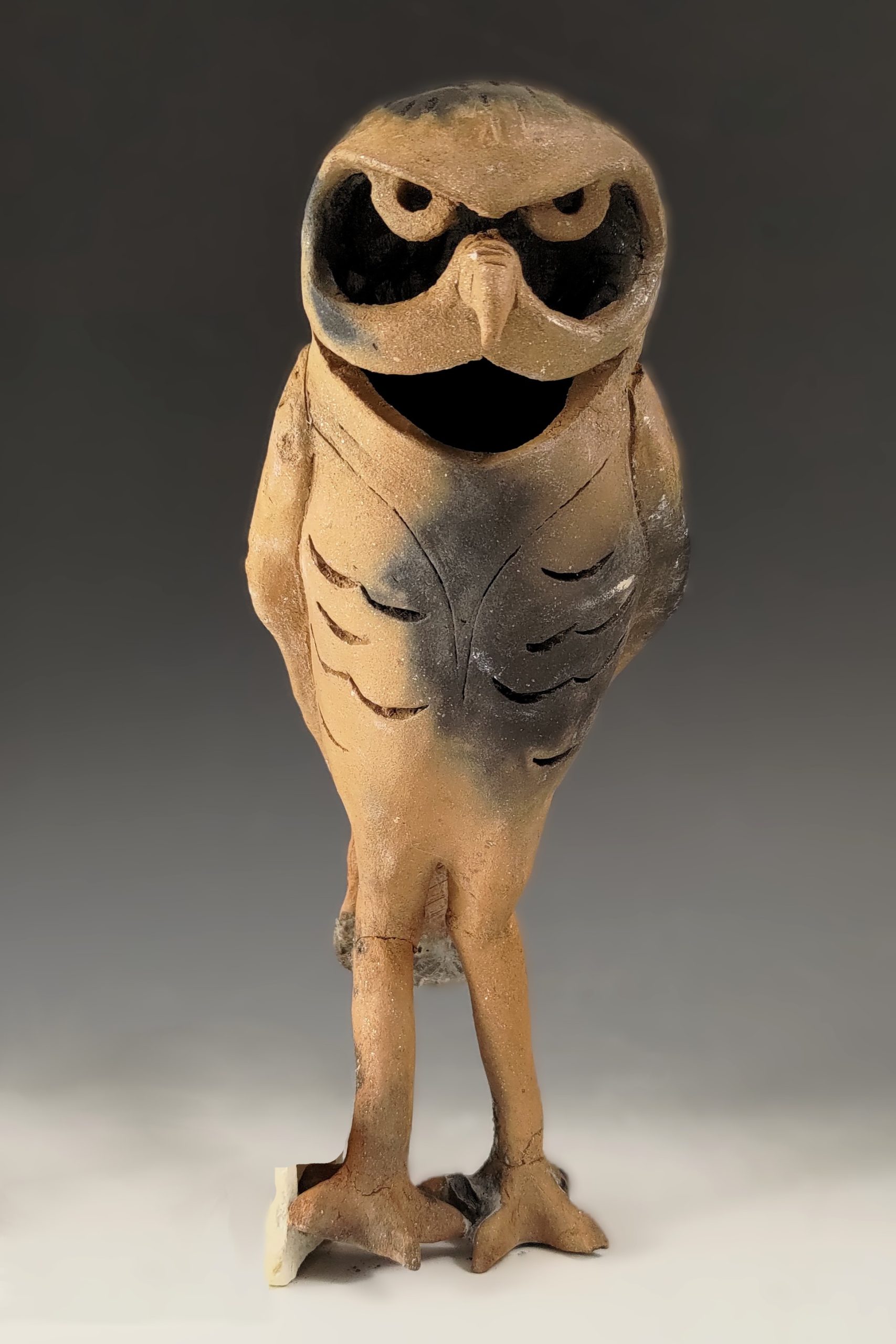 The fierce stare of this owl has a subtle sparkle because it was made out of micaceous wild clay and pit fired. The clay was collected locally in Virginia and the piece created in 2019. As you can see from the missing toes and mended breaks it is a very fragile piece. Unfortunately it ended up with carbon coring which occurs when there is not enough oxygen in the fire to burn off the carbon particles frequently found in wild clay. It creates a black core in a broken cross section of the ceramic and quite a brittle piece. It is one of my earliest sculptures which I did before I started to work with commercial clay.