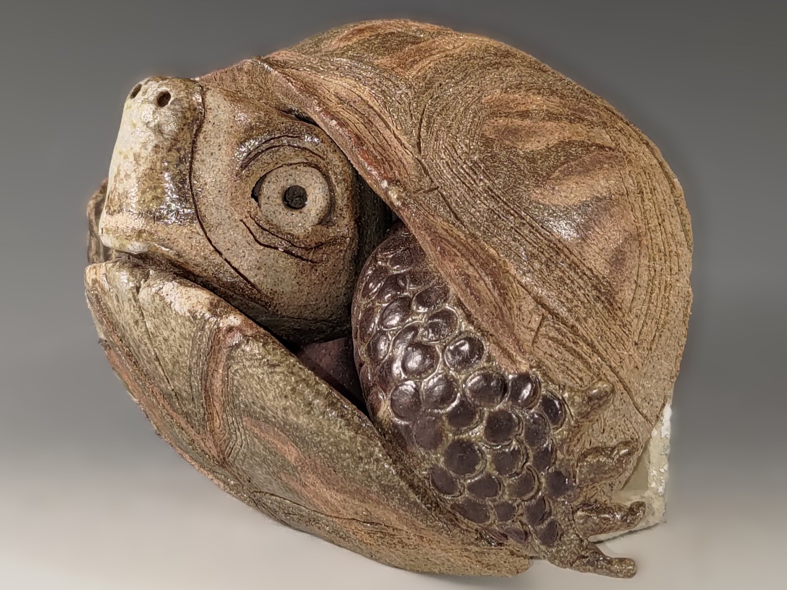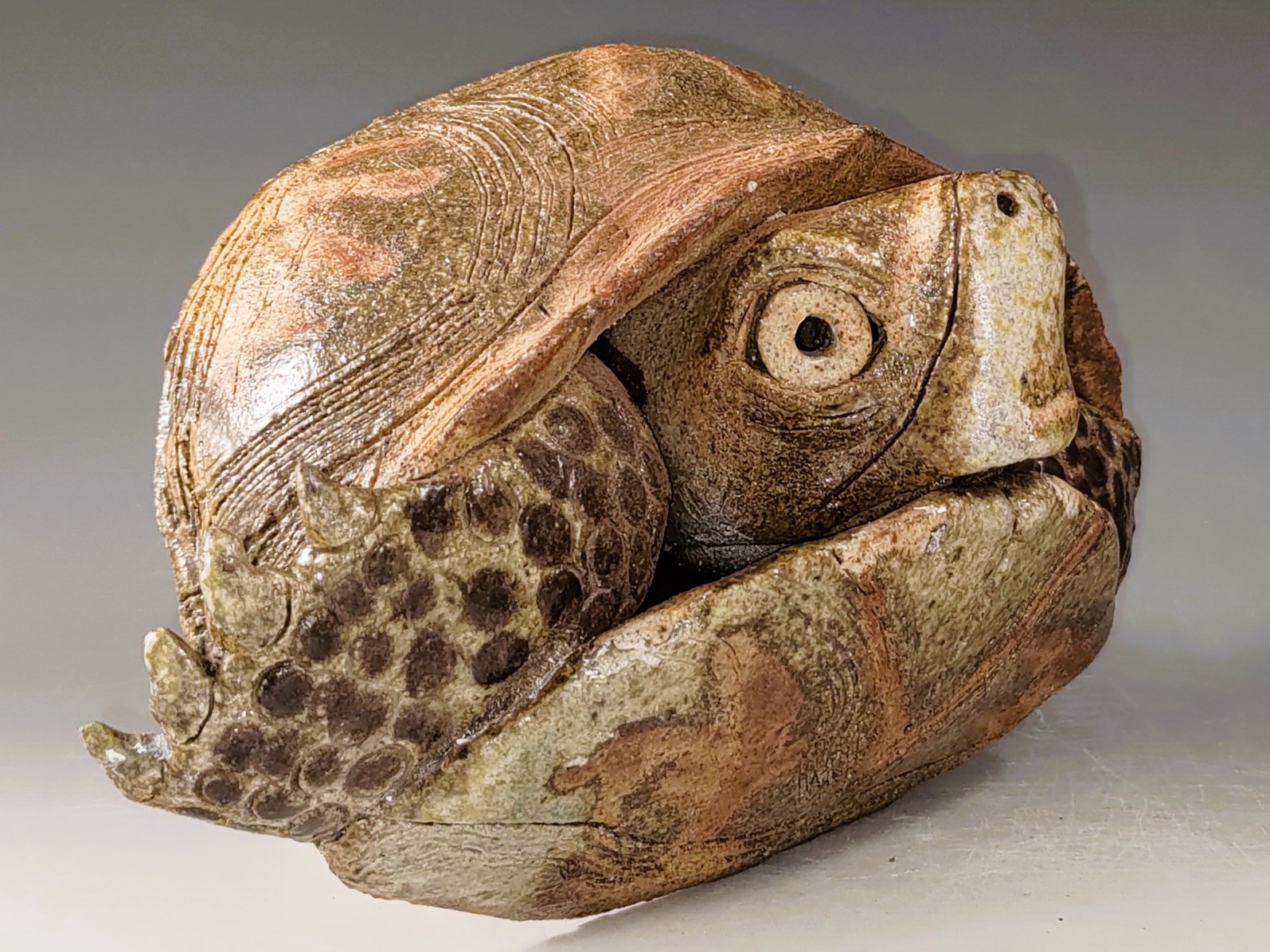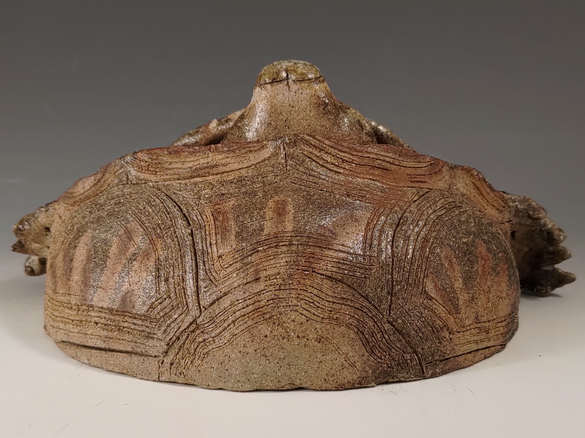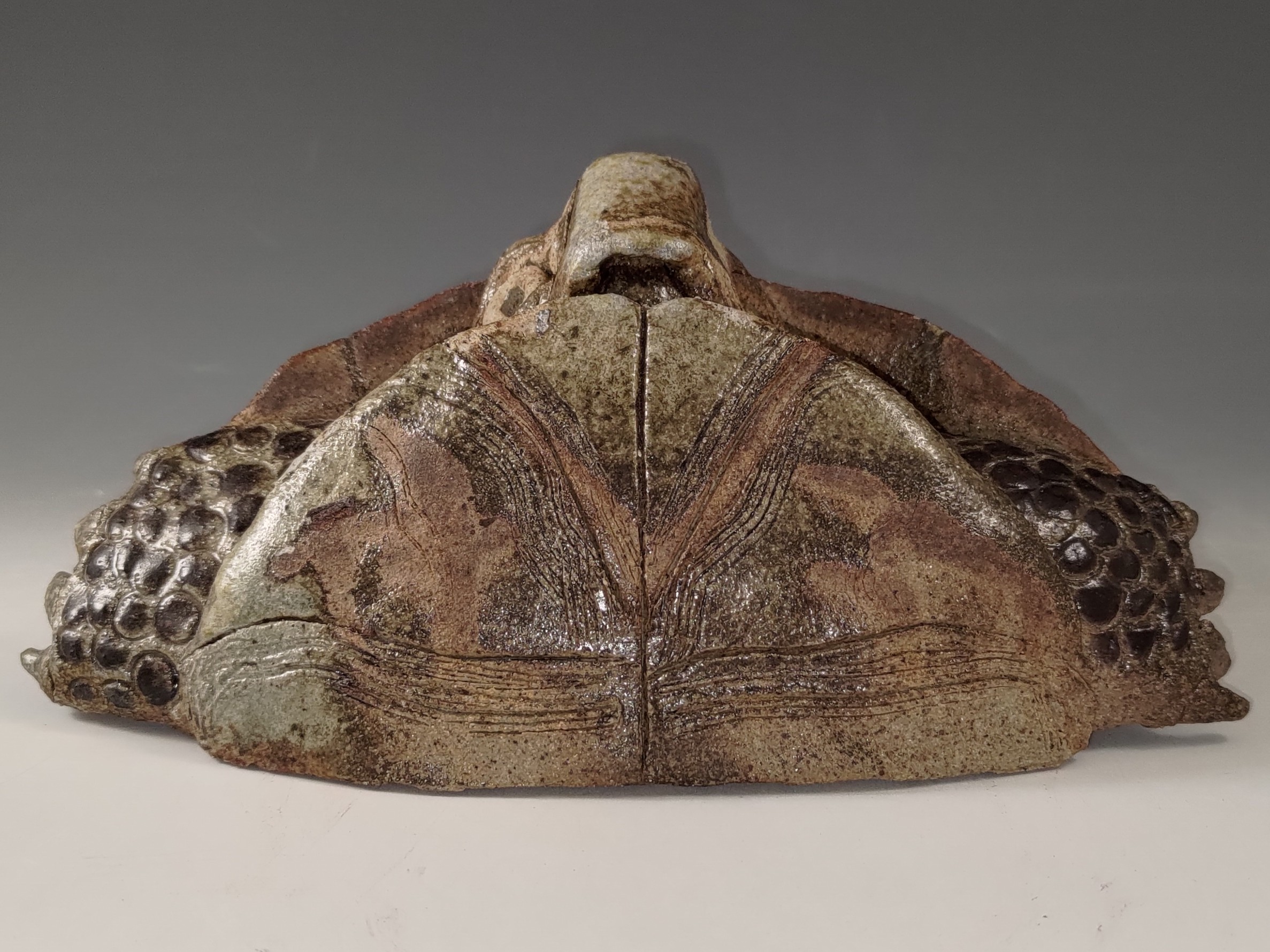 This lovely wall hung wood fired turtle is among my favorite pieces. In wood firing all the shiny glaze comes from melted wood ash that falls on the piece during firing so the piece goes into the kiln with no glaze on it. In order to keep the pieces from sticking to the shelves they are put on little clumps of refractory clay called wadding. One of the unintended but beautiful effects occurs when the flame causes flashing around the wadding and leaves a bare spot behind. It works a bit like a resist because the ash can not settle on that spot. For this piece I used that void creation to create the design on the bottom and top of the shell. The flashing effect in this case is only subtle. The piece is based on the ornate box turtle that occurs in West Texas, where I was based at the time.