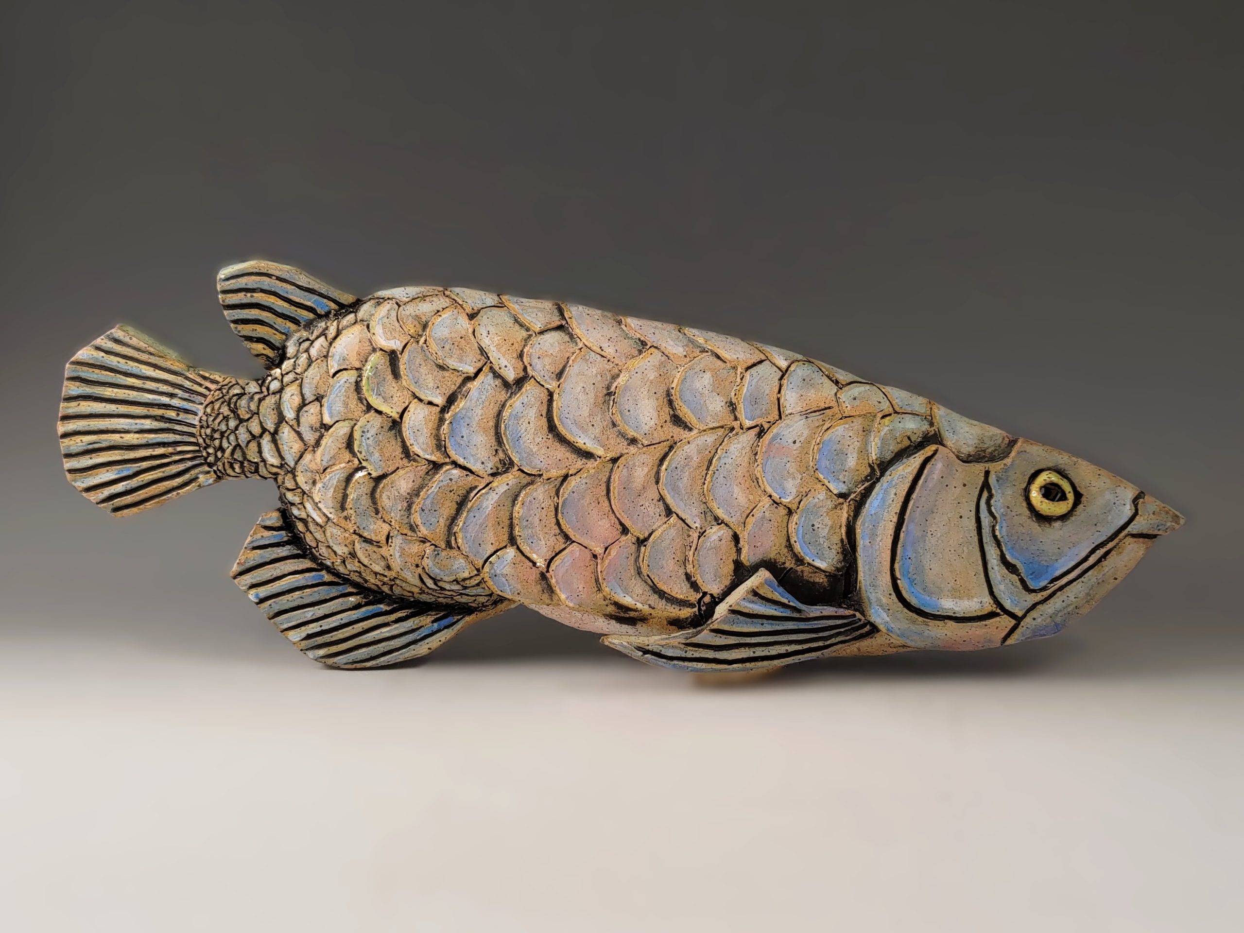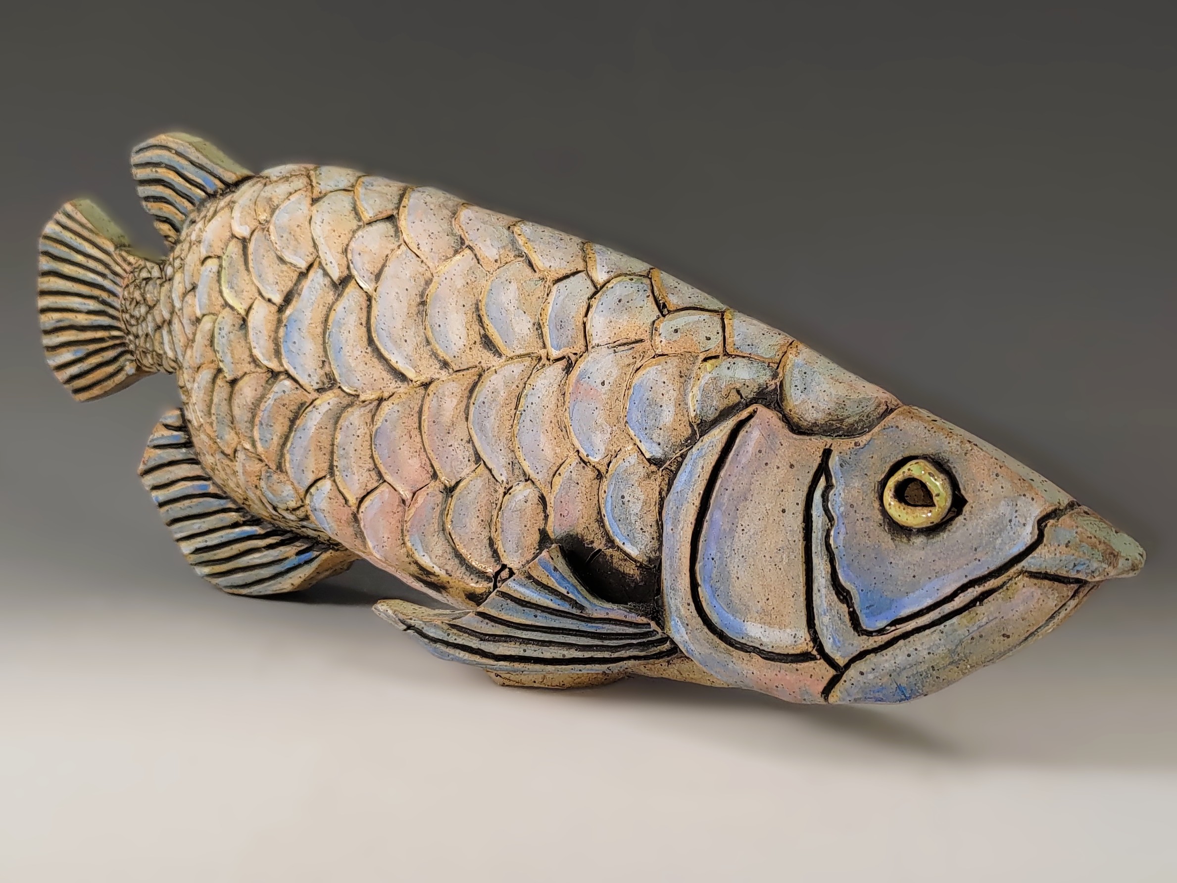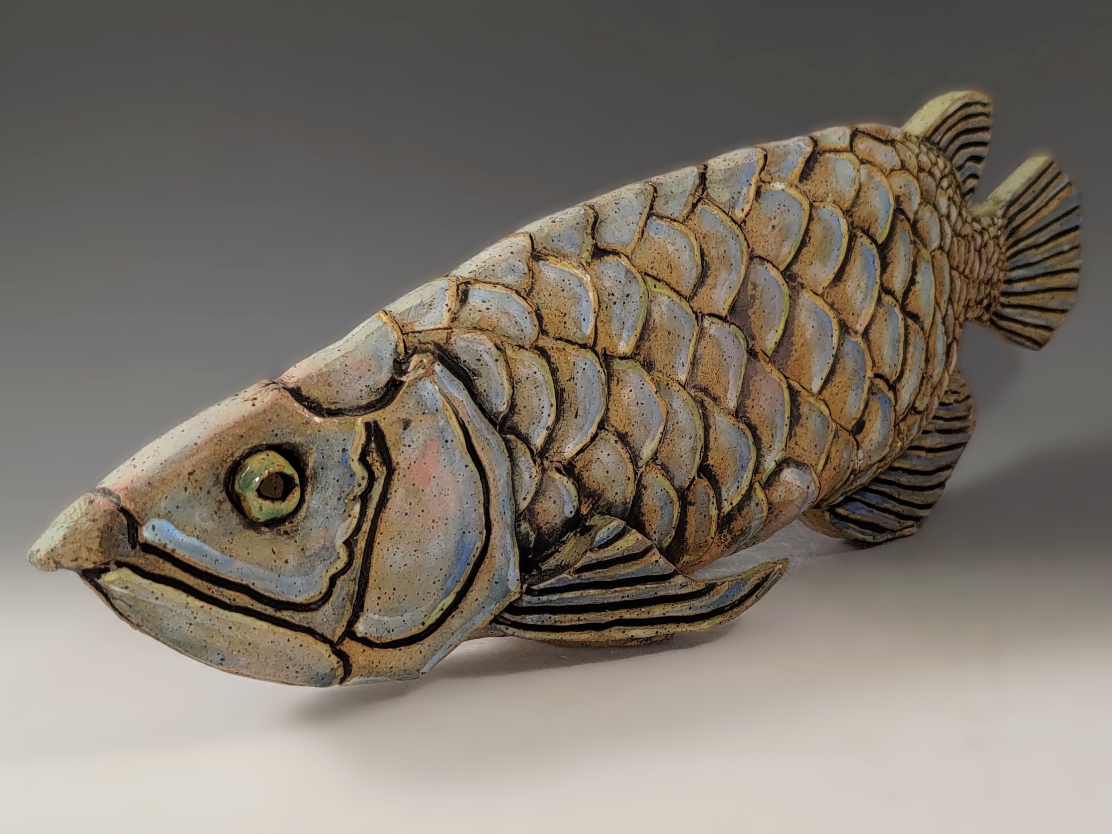 This piece was made during development of the template for my first workshop. During the process of creating a template I make several pieces using them for refinement and troubleshooting. One of the things I like about them is that they come together relatively rapidly and give me the freedom to experiment with finishes. I like how this blue came out with touches of green glaze along the edges of the scales. In the future I plan to increase the intensity of the green and blend the colors more.