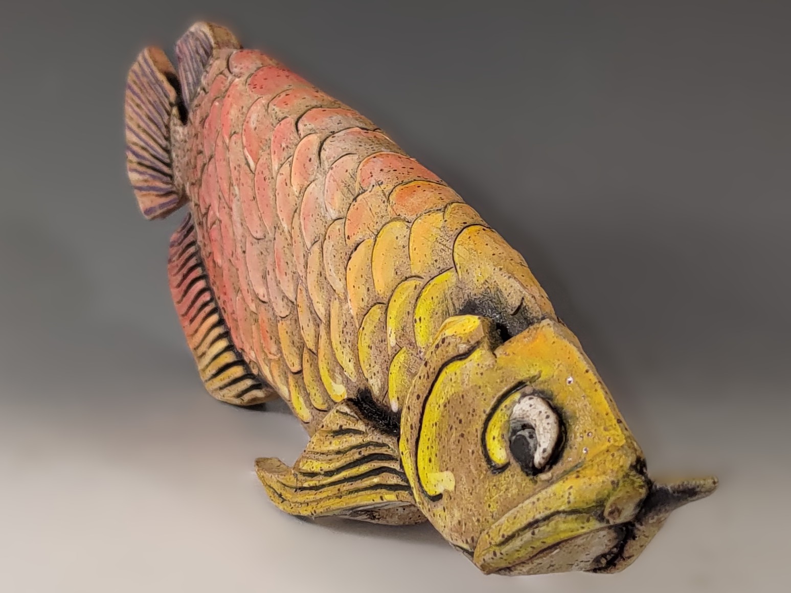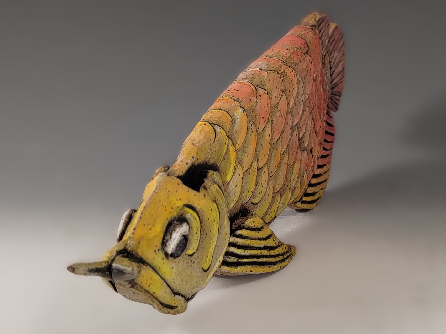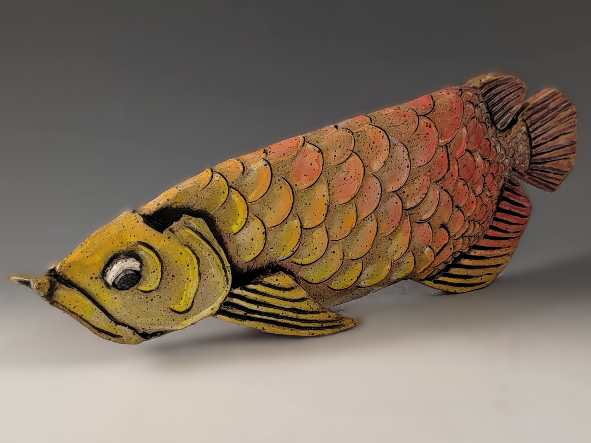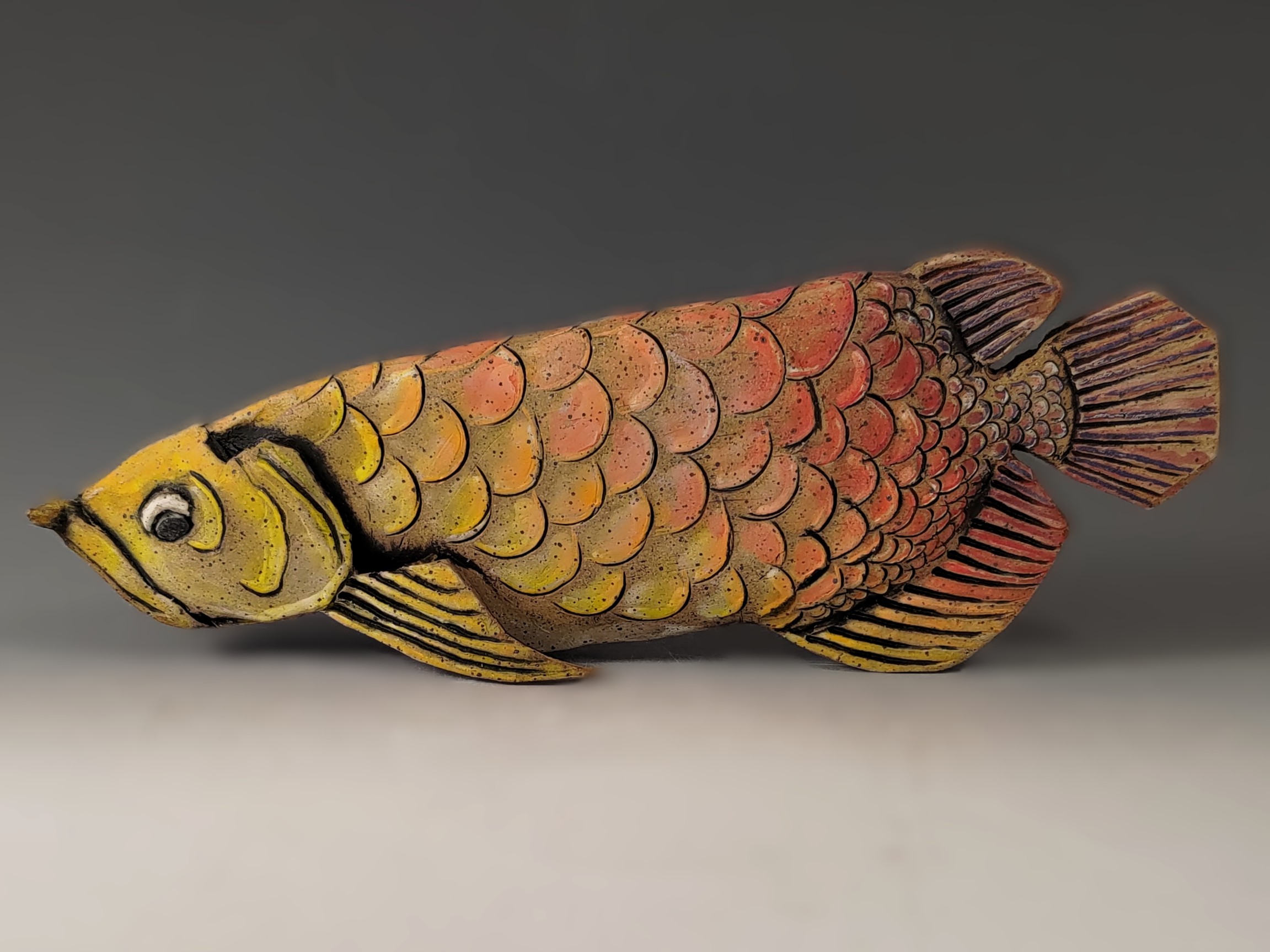 This is the final version of my Arawana template developed for my workshop series. Read more about that here. I seem to either gravitate toward bright colors or earth tones. I like this combination of the two which uses an underglaze water color technique that results in a blended gradient. It is created by making a pool of underglaze inside an outline of sharpie marker resist. The piece is tilted so that the pool shifts toward one end of the outline. More water down underglaze is added with a large calligraphy brush to keep it wet on one end and deposit more color. Once it dries completely the result is a smooth gradient. Gradients can be layered to add depth and introduce different hues.