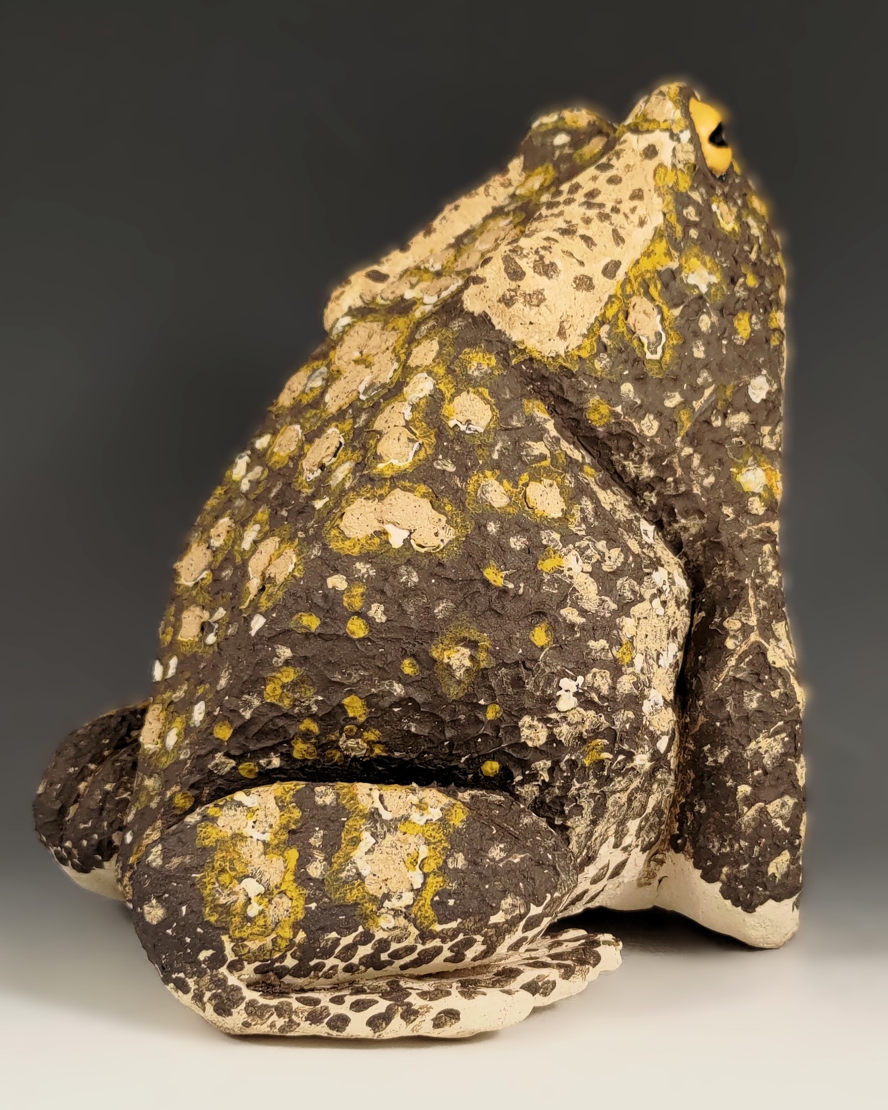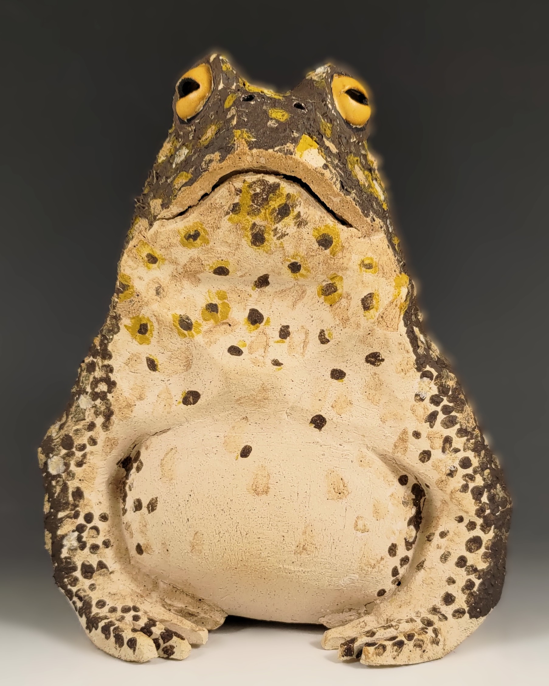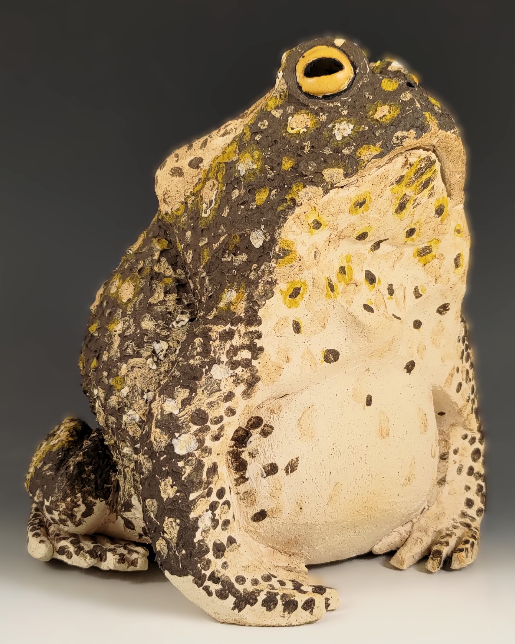 Brutus is the result of my dive into making frogs in 2025. He reminds me of the huge cane toads I saw along the southwest coast in Costa Rica. Strictly speaking it should be Brutusa because only the females get that large. Brutus was named because before he was decorated he was in the scraped back angular style of my larger pieces. My partner remarked on how much the angular style reminded him of brutalist architecture. I softened that a bit by using several different slips to decorate him. The texture that resulted is lovely.