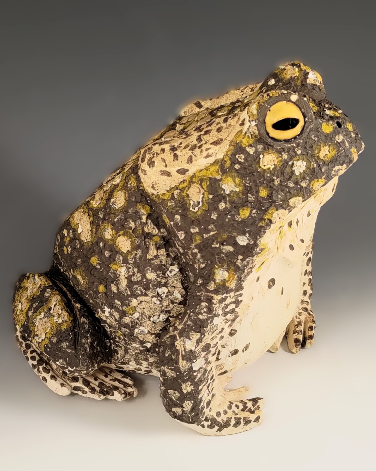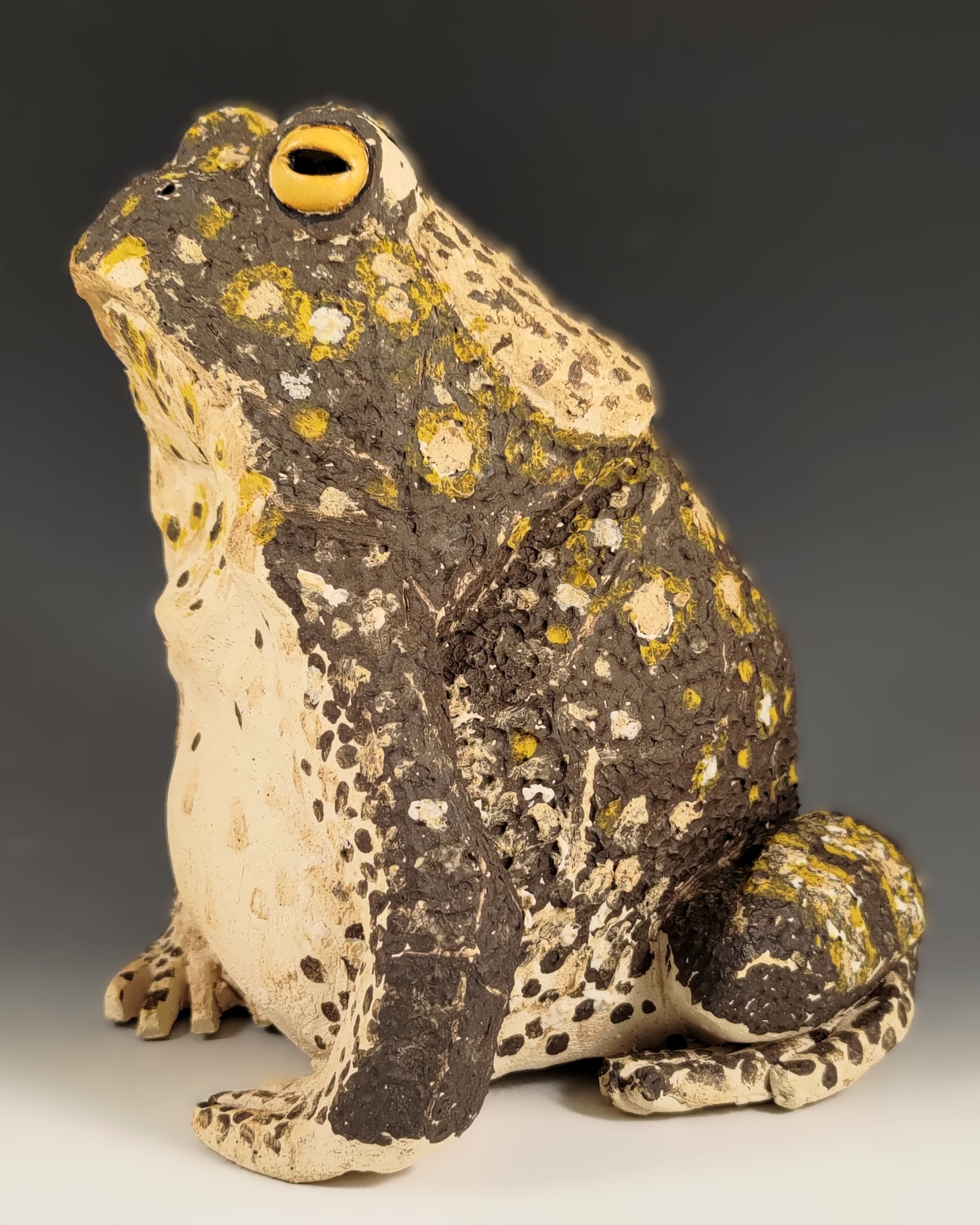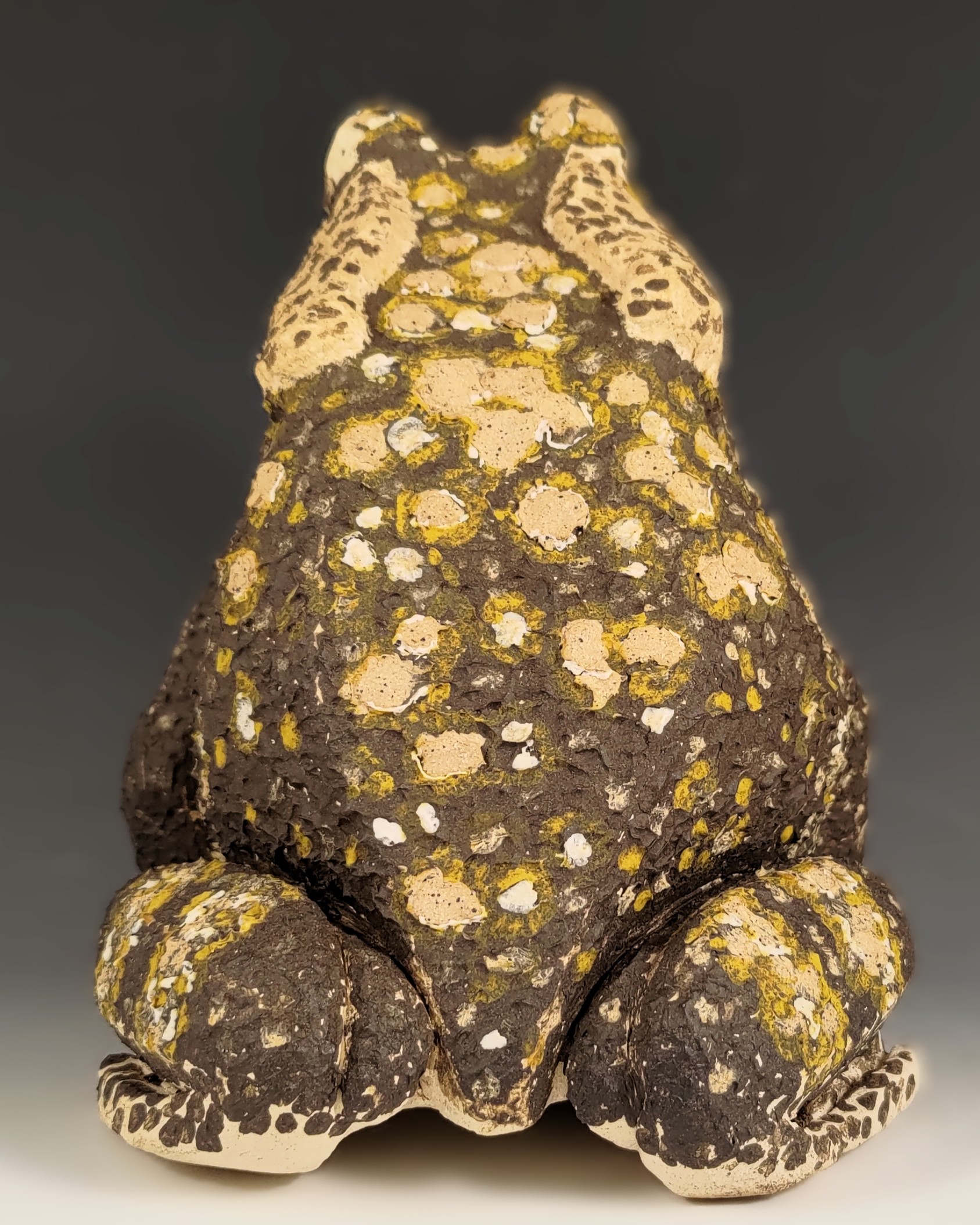 Brutus is the result of my dive into making frogs in 2025. He reminds me of the huge cane toads I saw along the southwest coast in Costa Rica. Strictly speaking it should be Brutusa because only the females get that large. Brutus was named because before he was decorated he was in the scraped back angular style of my larger pieces. My partner remarked on how much the angular style reminded him of brutalist architecture. I softened that a bit by using several different slips to decorate him. The texture that resulted is lovely.