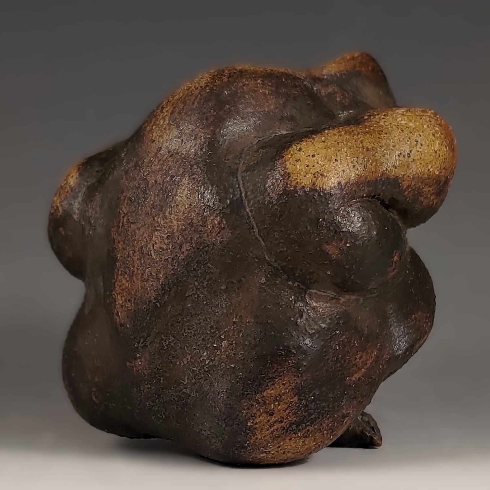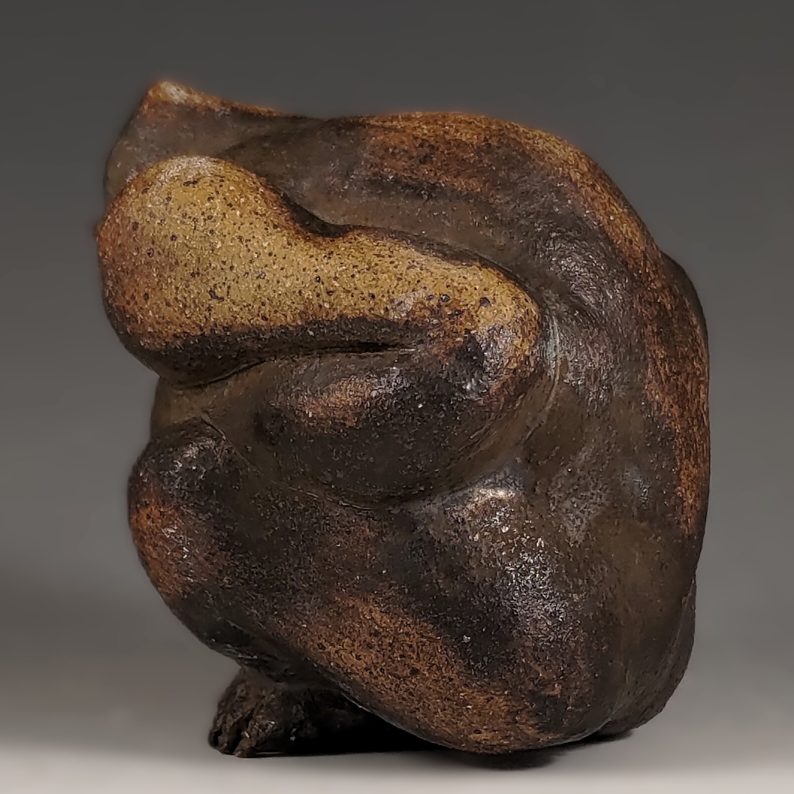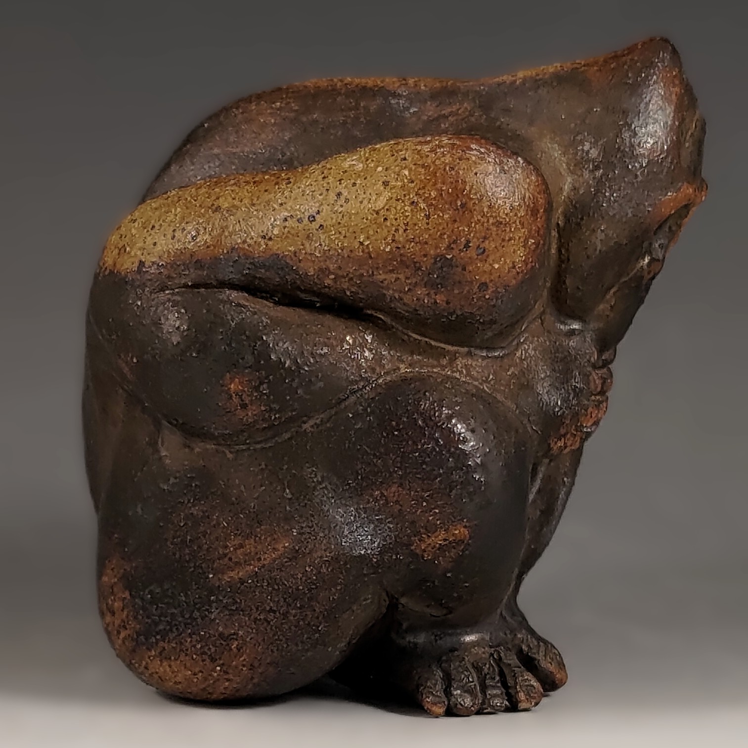 This is another one of my favorite pieces and one I will be hanging on to. She was created in 2019 as part of my short gorilla series that all began with a cube made of slabs that is then sculpted . I love the pensive wide eyed look on her face. It reminds me of myself when I get the chance to hunker down near a stream and watch the fish and other critters. I get completely absorbed. She was meant to be a maquette but I am happy with the size. It is a series I have considered continuing.